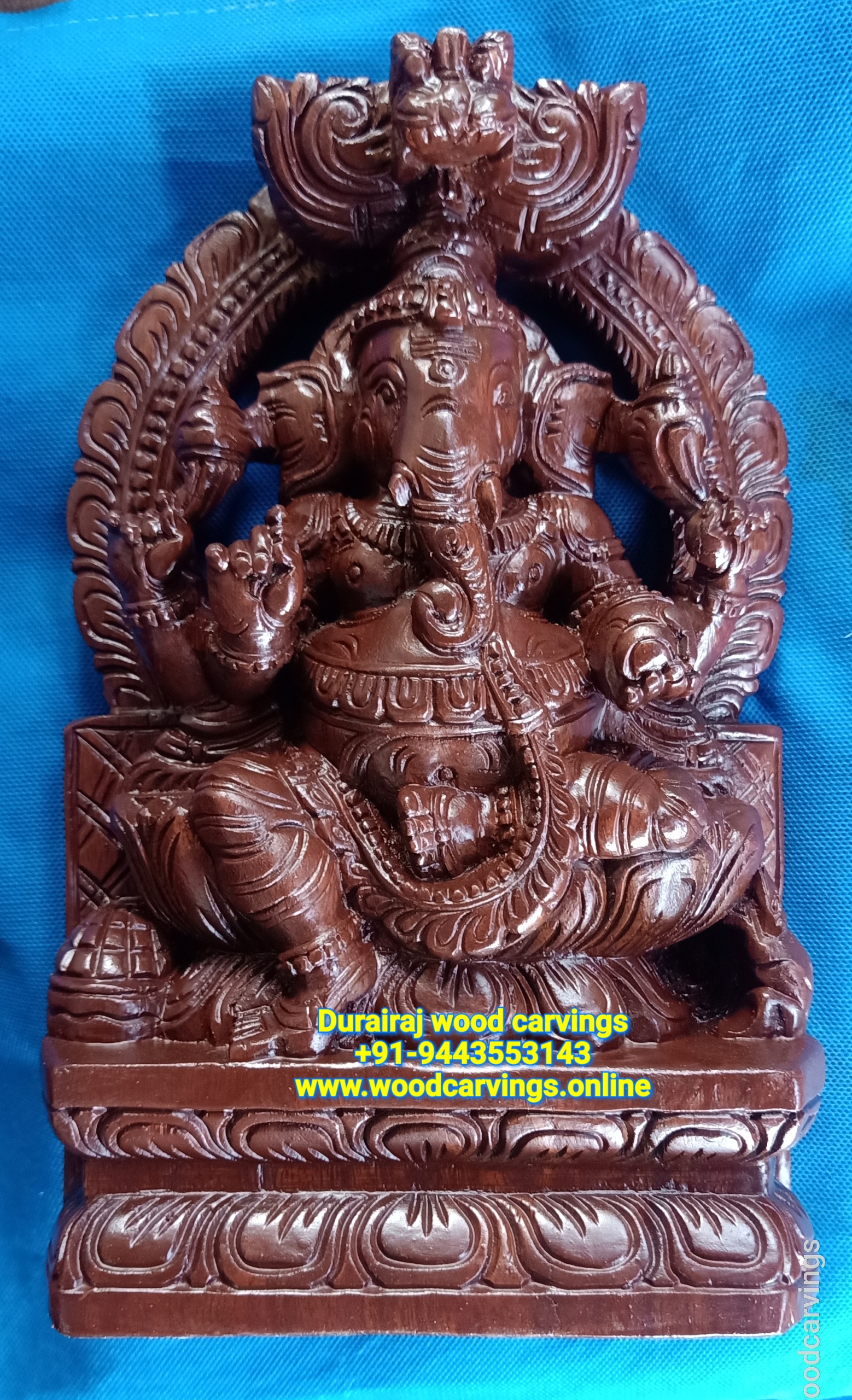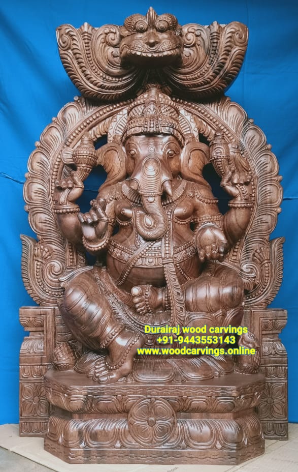 Wooden carvings- Ganesha sitting on Lotus with umberlla top